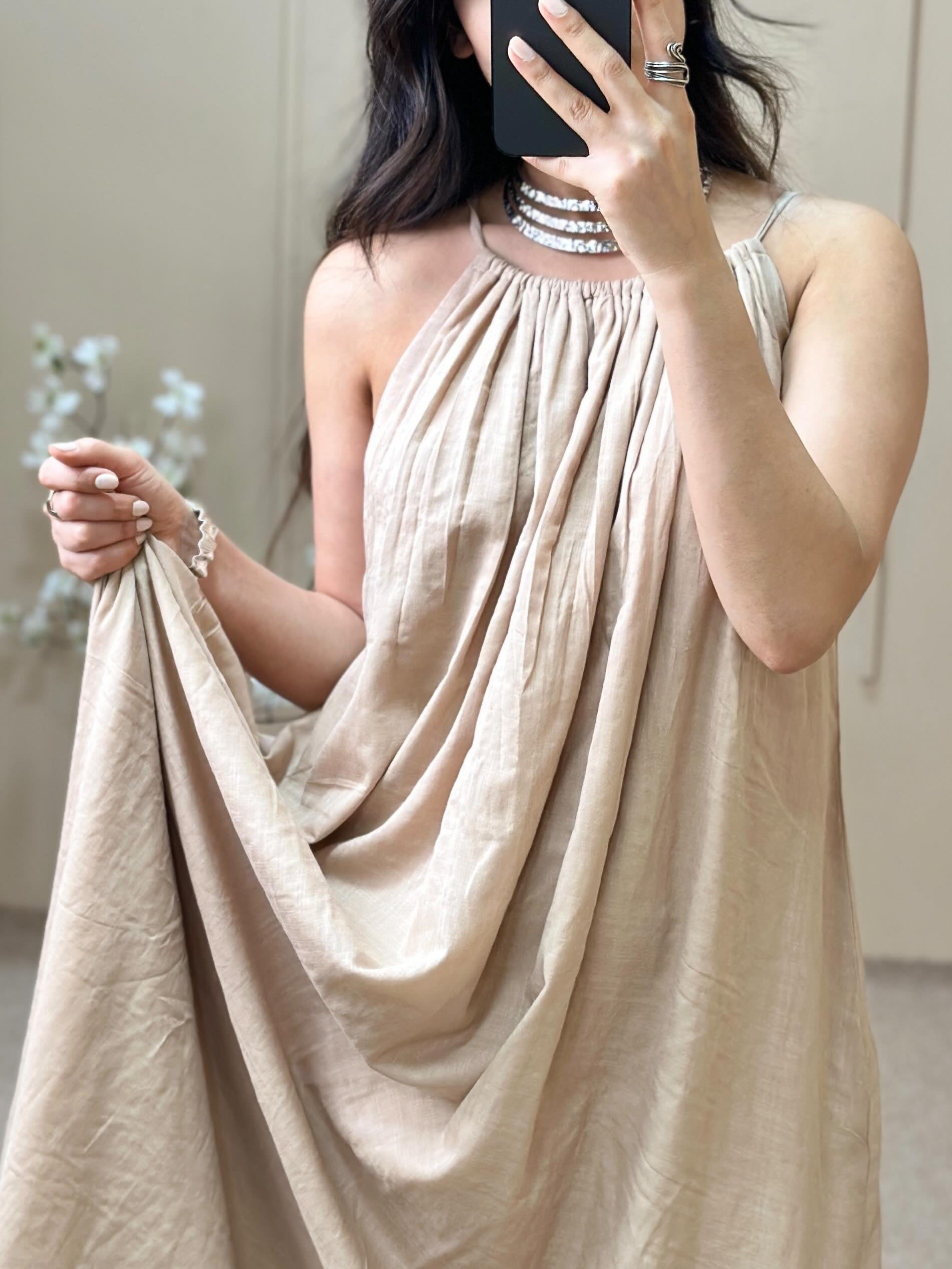 Intemporelle et naturellement élégante, cette robe longue beige respire la sophistication discrète avec ses lignes épurées et sa teinte neutre polyvalente. Ses bretelles réglables permettent un ajustement personnalisé, la rendant aussi confortable que chic.