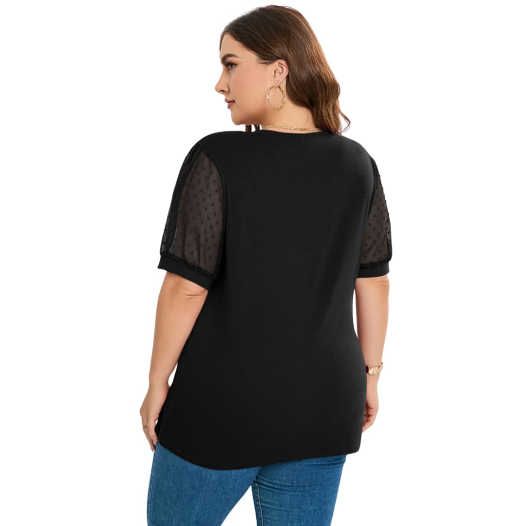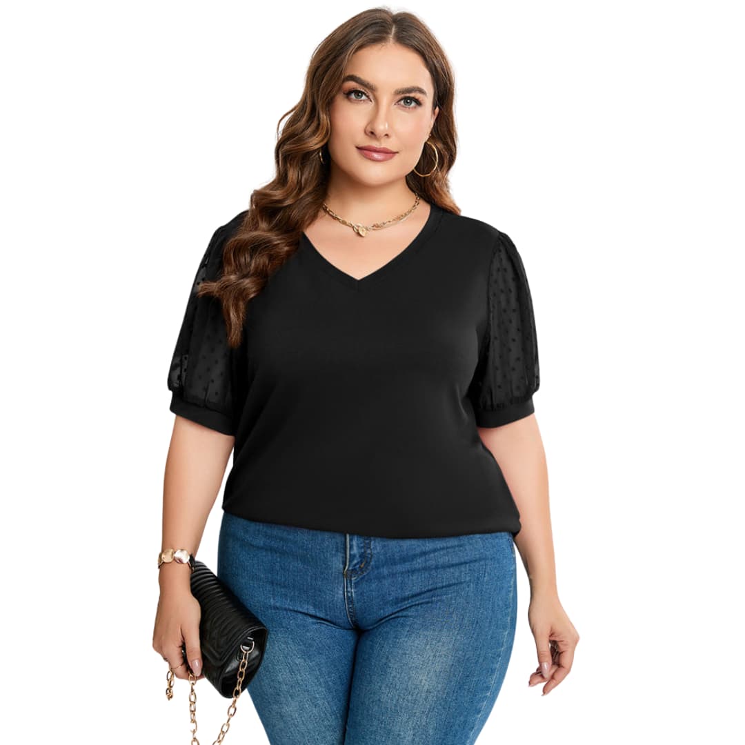 Women's summer top made from lightweight fabric suitable for warm-weather wear. Features include a V-neckline, short puff sleeves, and semi-sheer textured detailing. Designed with a feminine silhouette and constructed for ease of care. Suitable for day-to-night use and casual settings.