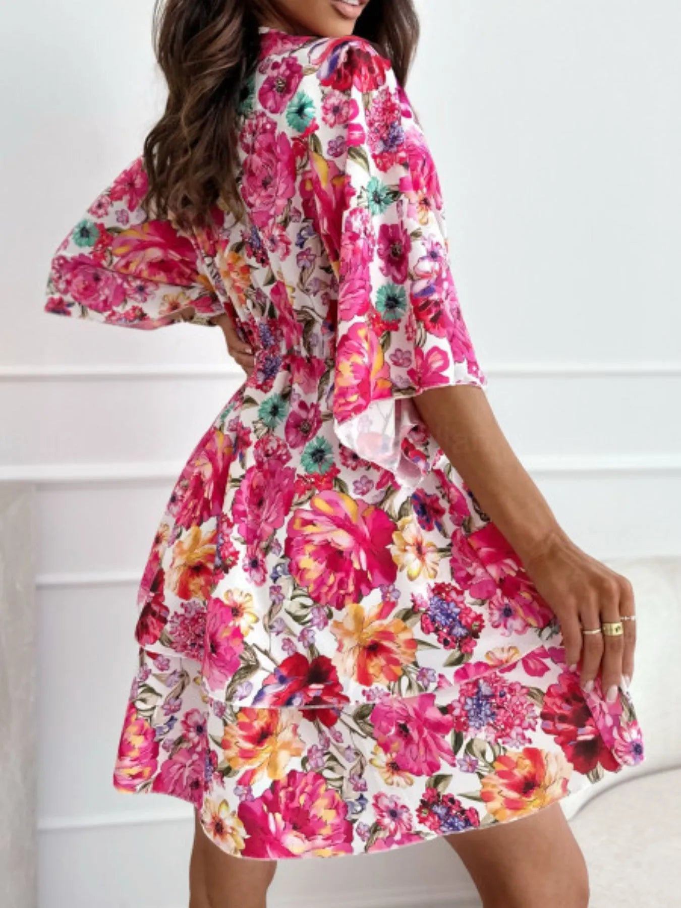 Swag into sunshine with this Floral Print V-Neck Ruffle Mini Dress. Its playful ruffles and vibrant floral pattern bring a fresh, flirty vibe perfect for warm days and fun nights. The flattering V-neckline adds a touch of charm, while the mini length keeps your look light and breezy. Ideal for garden parties, brunch dates, or any occasion where you want to feel effortlessly joyful.