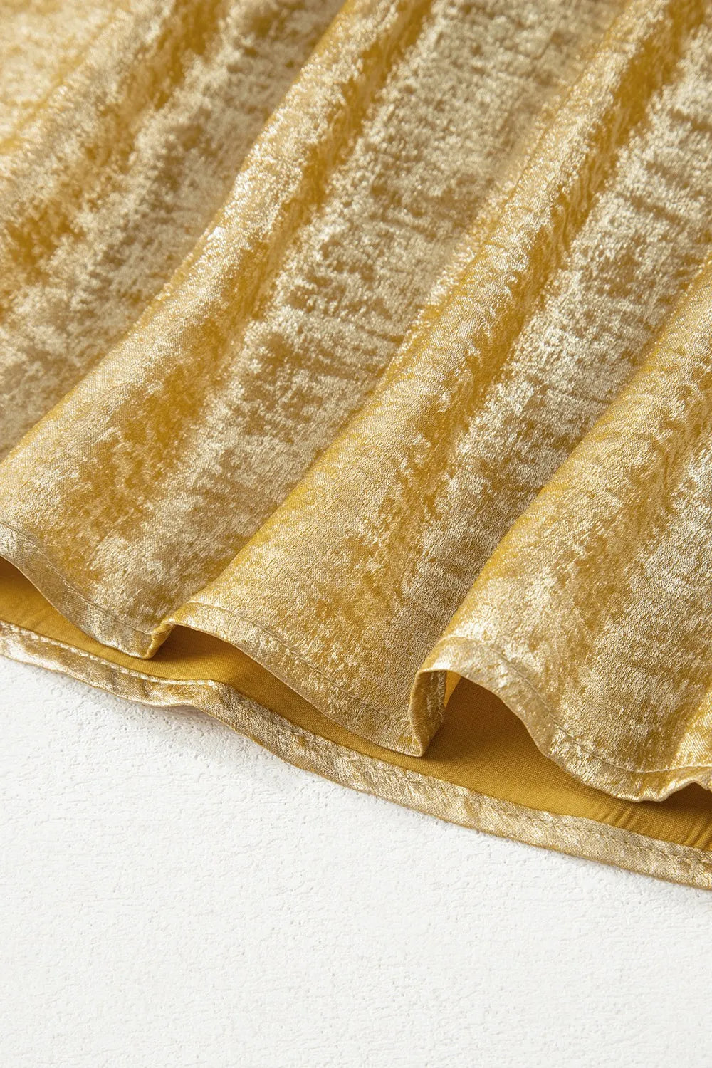 Shimmer and shine in this eye-catching Metallic Gold Short Sleeve Casual Blouse! Perfect for turning heads at brunch or adding a pop of pizzazz to your everyday wardrobe. This playful piece effortlessly blends comfort with glamour, making even grocery shopping feel like a runway moment. Dress it up or down—either way, you'll sparkle!