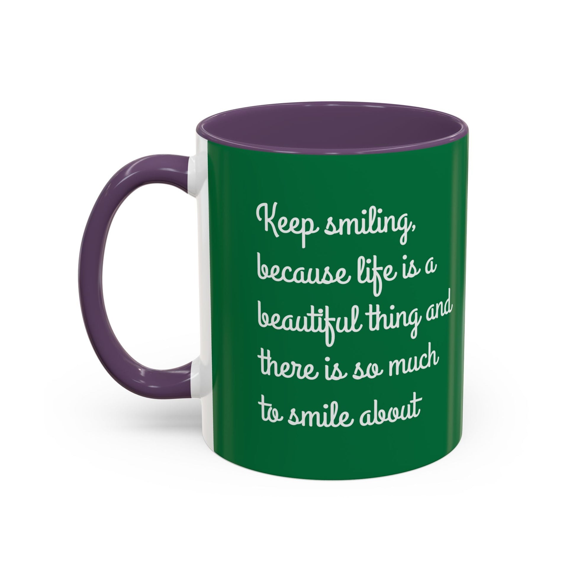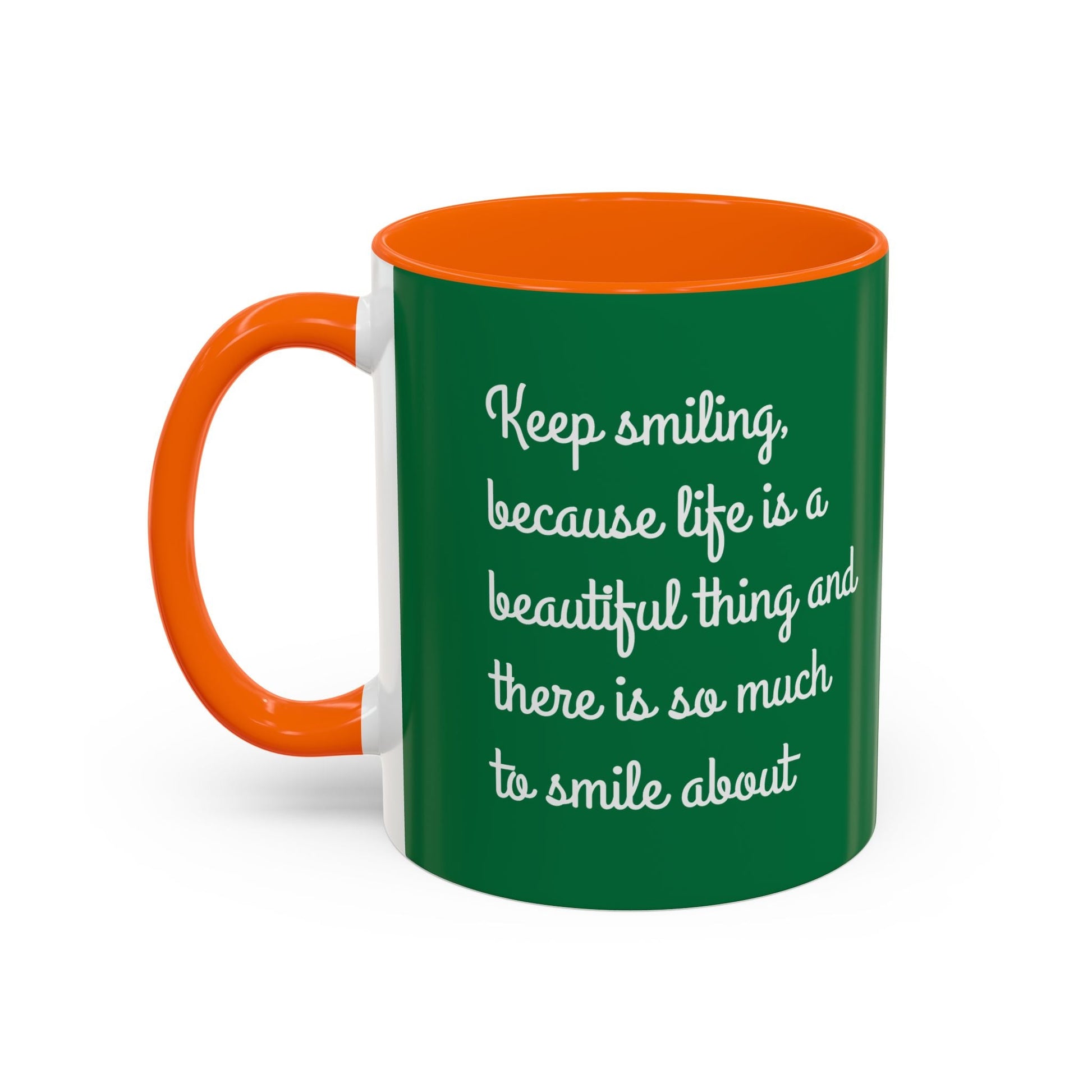 This coffee mug with a vibrant colored interior and handle is perfect for starting your day with positivity. The inspiring quote will remind you to keep smiling and appreciate the beauty of life. A great gift for coffee lovers and those who enjoy a daily dose of motivation. Ideal for birthdays, holidays, and just because gifts.