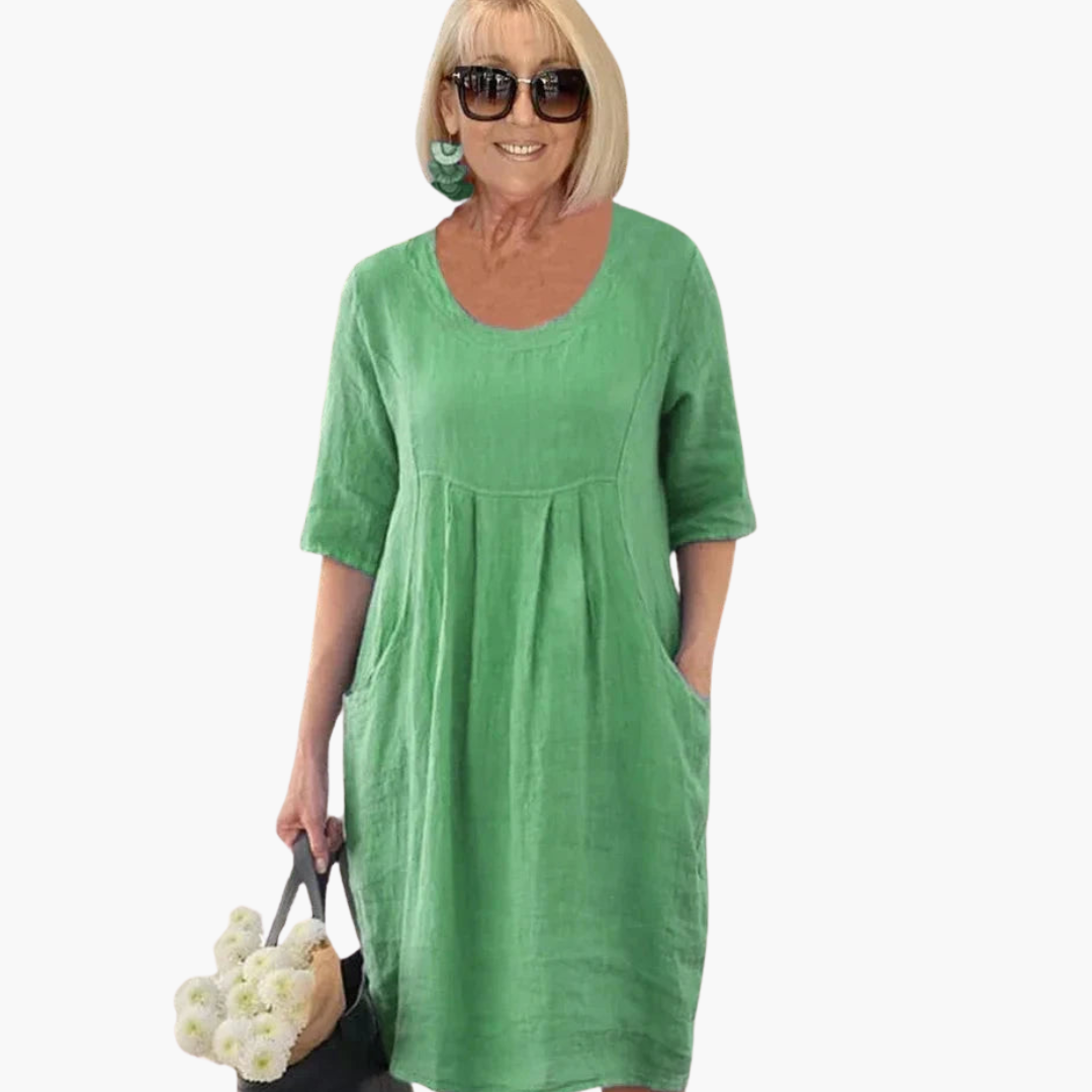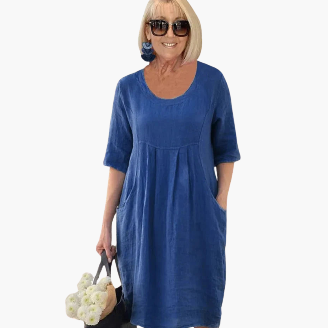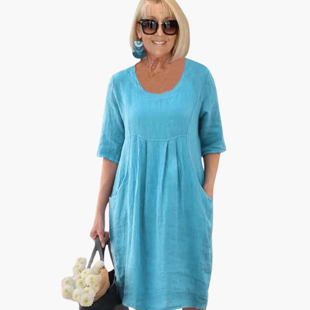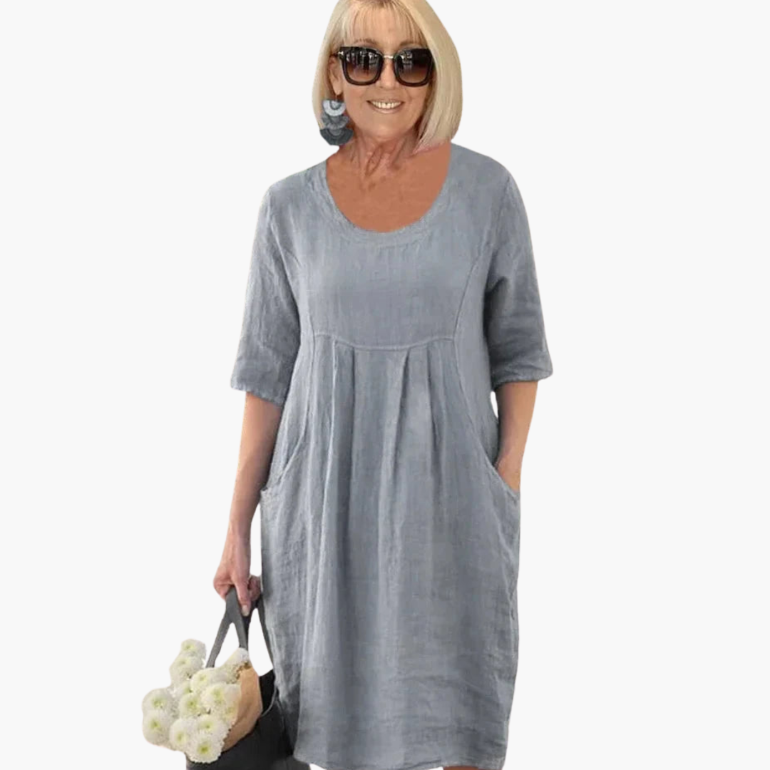 This women’s tunic-style midi dress is made from a lightweight fabric suitable for summer use. It features half-length sleeves, a round neckline, and a loose fit with front pleats. The dress falls to mid-calf length and includes two practical side pockets. It has no visible fastening and is designed for casual or daily wear.