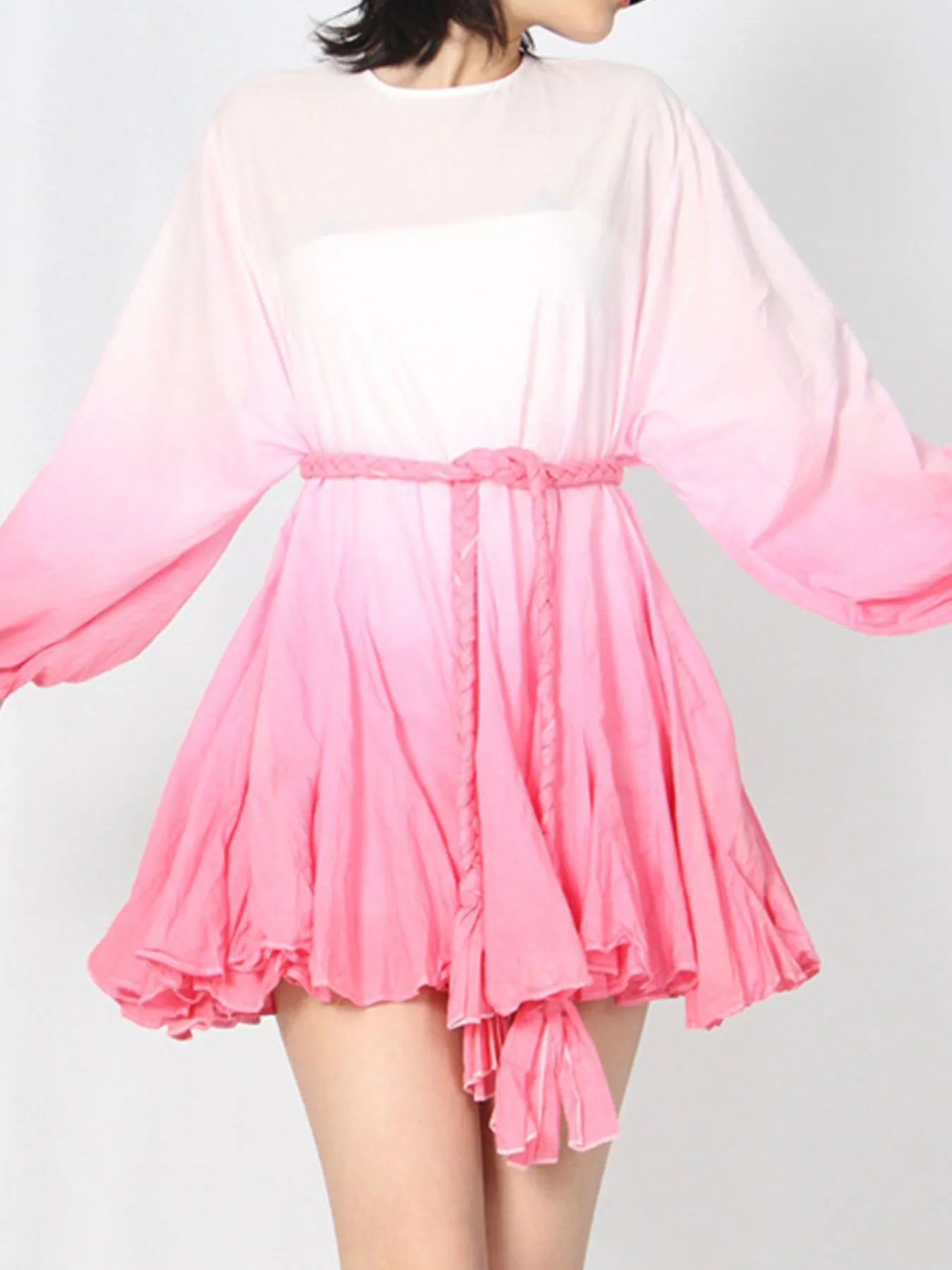 Pink and White Gradient Round Neck Balloon Sleeve Dress – Ombre Long Sleeve Mini Dress for Women