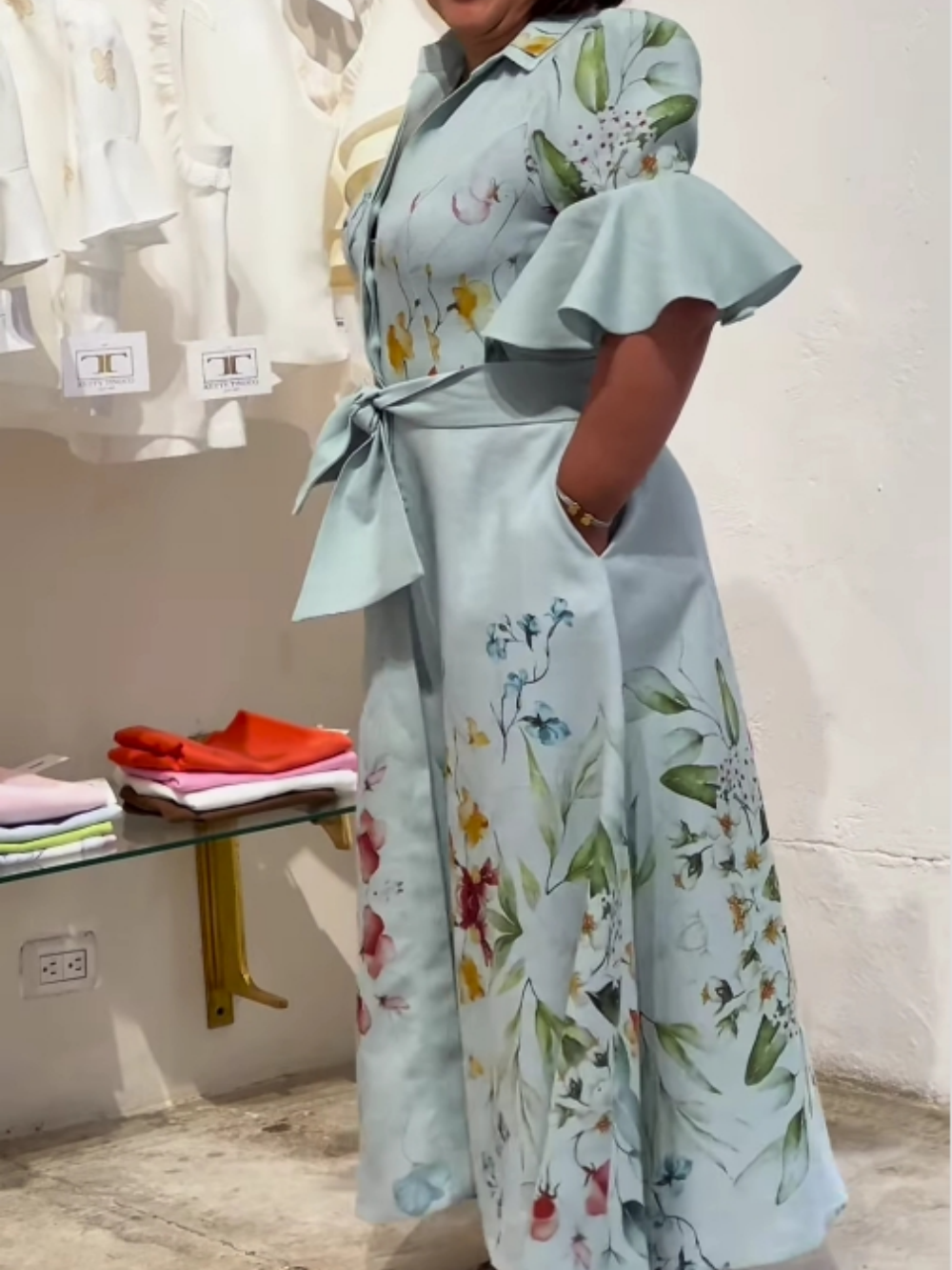 Puff Sleeve Ruffle Printed Lace-Up Dress