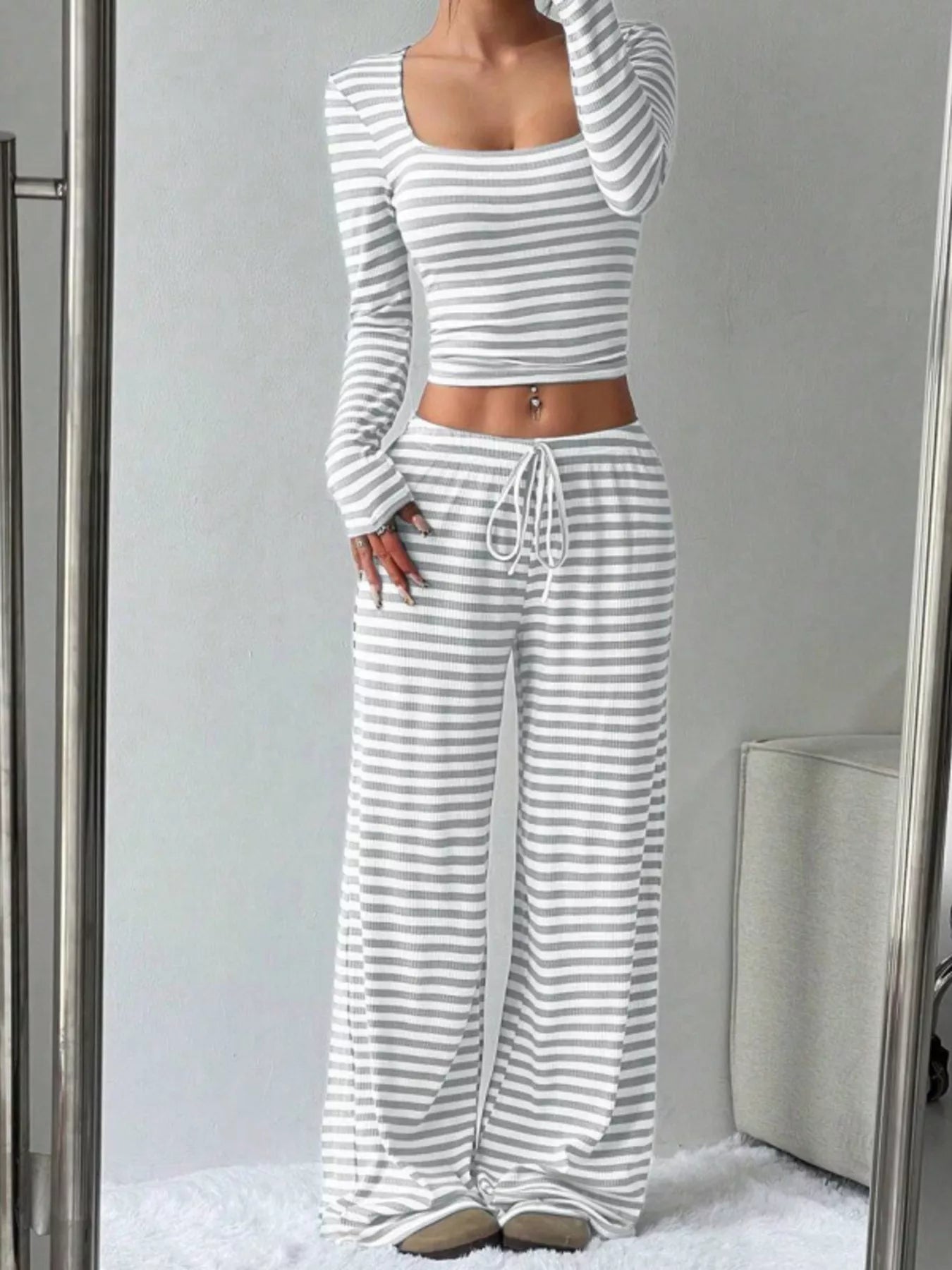 Striped Long Sleeve Crop Top & Wide Leg Pants Set