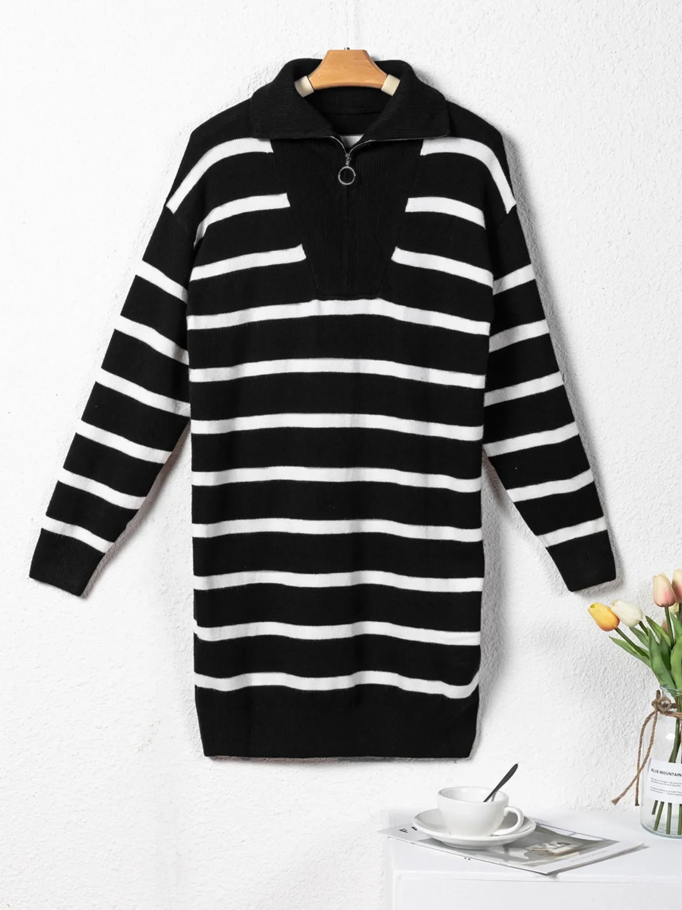 Swag On in style with the Striped Sweater Mini Dress, a fun and flirty choice for any casual occasion. Its cozy knit fabric keeps you warm while the playful stripes add a pop of personality. Perfect for pairing with boots or sneakers, this mini dress brings effortless charm to your wardrobe.