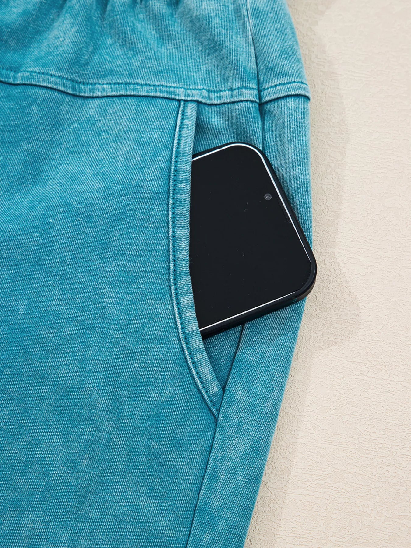 These teal mineral wash pants combine standout style with practical comfort. The high waist and relaxed fit flatter every figure, while the patched pockets and vibrant color make them a statement piece you’ll reach for again and again.