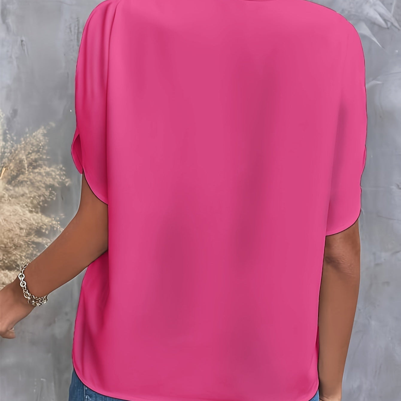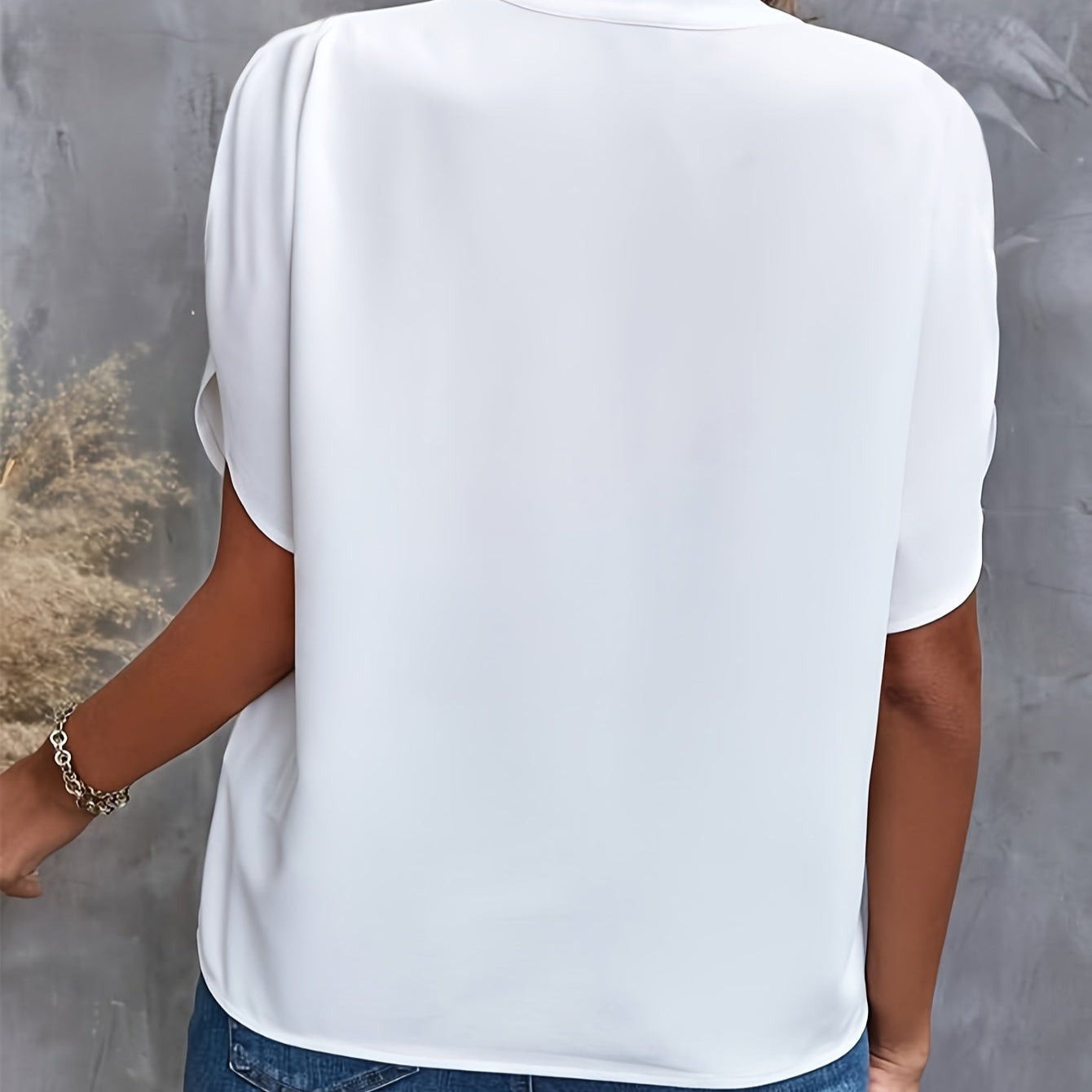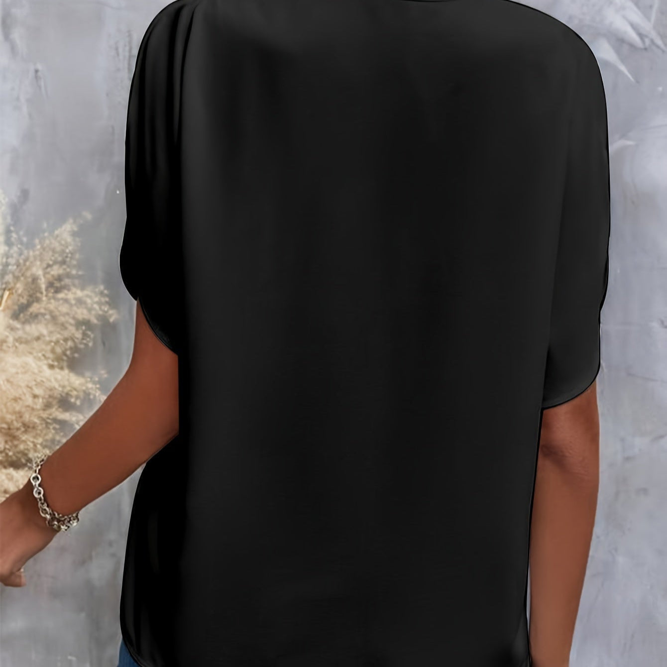 Women’s blouse made from lightweight fabric suitable for all-season use. Designed with a relaxed fit, short sleeves, and a V-notch neckline. Features a curved hem with side slits for ease of movement. Suitable for both casual and office settings.